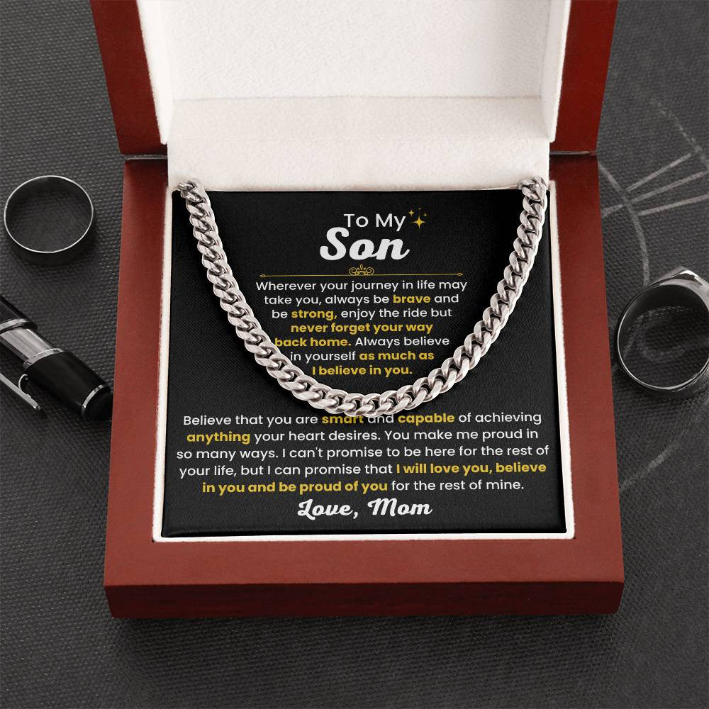Give your son a meaningful gift that symbolizes strength, love, and guidance with the "Always Be Brave" Cuban Link Chain. Featuring a heartfelt message card, this necklace serves as a daily reminder for your son to stay strong, brave, and true to himself as he navigates life’s journey. Whether for his birthday, graduation, or just to show how much you care, this timeless piece will be a cherished keepsake.