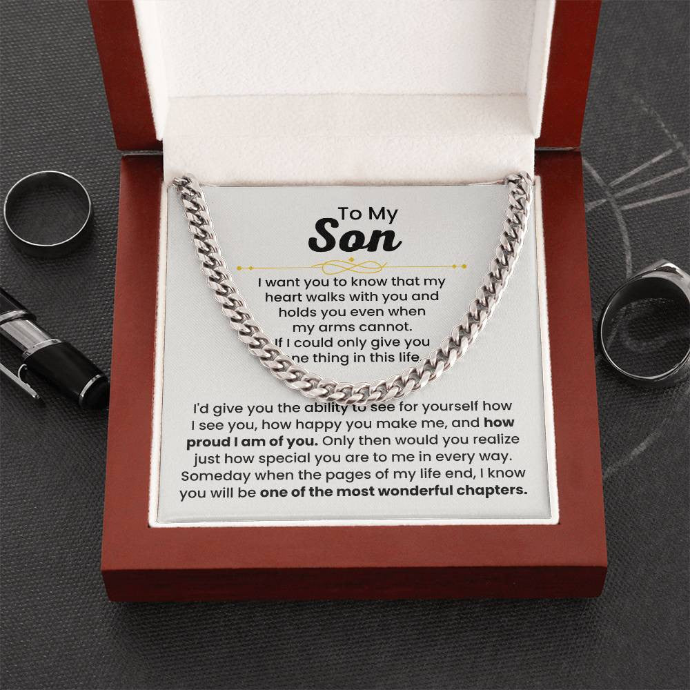 Gift your son a timeless symbol of love and pride with the "Heart Walks With You" Cuban Link Chain. This meaningful necklace, accompanied by an inspiring message card, reminds him that no matter where life takes him, your heart will always walk with him. Whether it's for his birthday, graduation, or simply to express your love, this Cuban Link Chain serves as a powerful token of support, strength, and unconditional love.