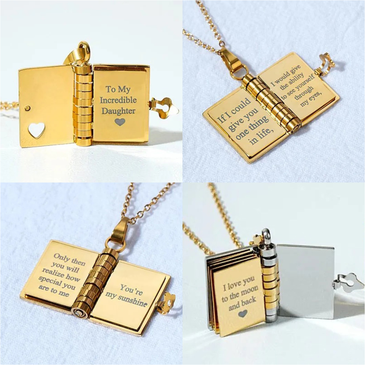 Each mini book necklace opens like a real book, with six deeply personal pages engraved with your unwavering love: