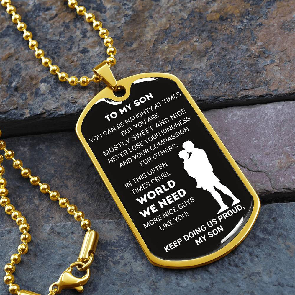 Gift your son a keepsake that carries a powerful message of kindness and love with this Dog Tag Necklace from Dad. The engraved words are a heartfelt reminder to stay true to himself in a world that needs more kind-hearted individuals like him.