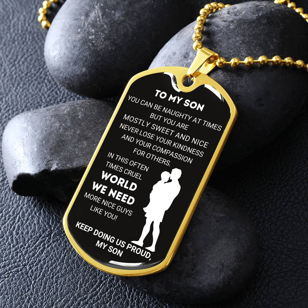 Crafted from high-quality surgical steel, with an optional 18k gold finish, this dog tag is a meaningful gift for special occasions like birthdays or graduations, or simply as a reminder of your unwavering pride in him.