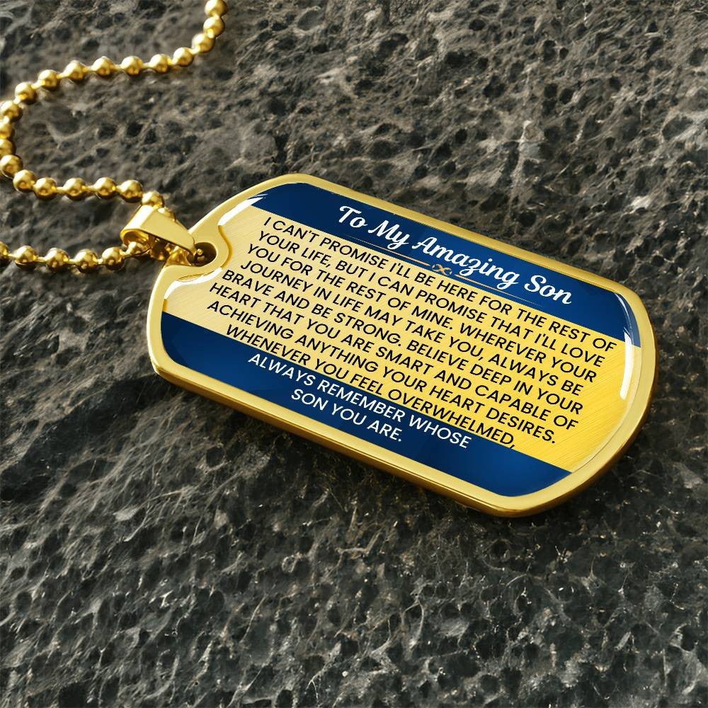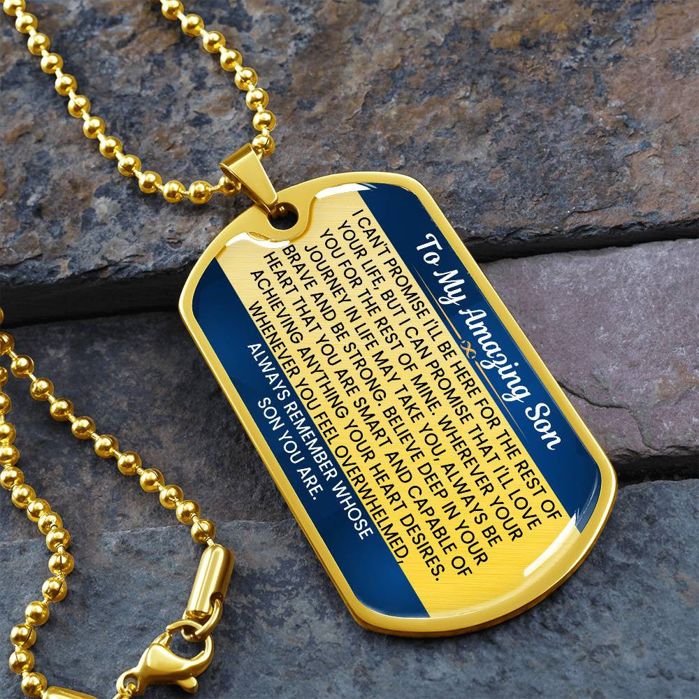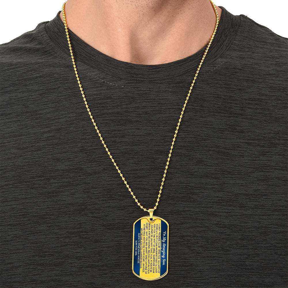 Give your son a gift that serves as a constant reminder of your unwavering love and support. This Dog Tag Necklace, crafted from premium surgical steel with an optional 18k gold finish, features a heartfelt message that will inspire him to be brave and strong, no matter where life takes him. The touching words engraved on the tag will remind him of his inner strength and the deep love you have for him, making it an invaluable keepsake.