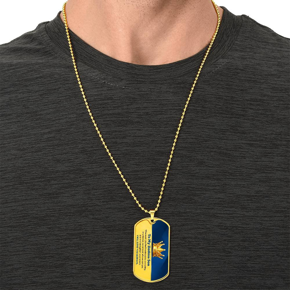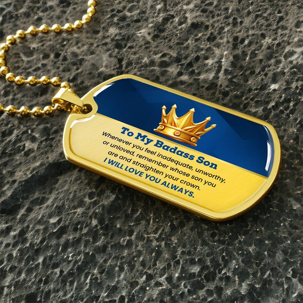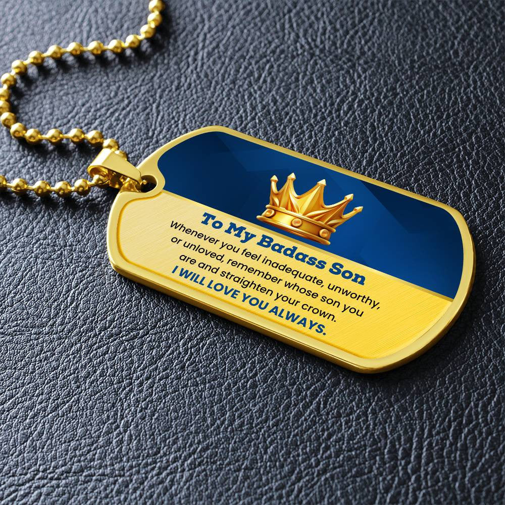 Empower your son with a gift that reminds him of his strength and your everlasting love. This Dog Tag Necklace, crafted from high-quality surgical steel with an optional 18k gold finish, carries a motivational message meant to uplift him during life's toughest moments. The engraved words will encourage him to always hold his head high, especially when he's feeling inadequate or unworthy, making it a truly meaningful keepsake.
