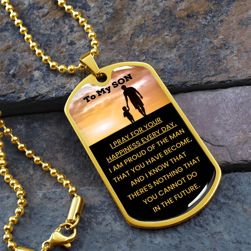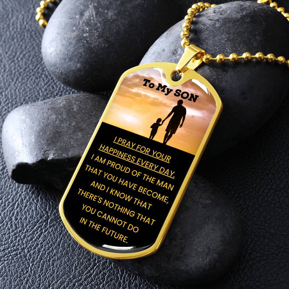 Give your son a meaningful gift that he can cherish forever with this Dog Tag Necklace, engraved with a heartfelt message. Crafted from high-quality surgical steel and available in an 18k gold finish, this keepsake symbolizes the eternal bond between a parent and their son. It's perfect for special occasions like birthdays, graduations, or just because you want to remind him of your love and support. The engraved message serves as a daily reminder that he will always be in your heart.