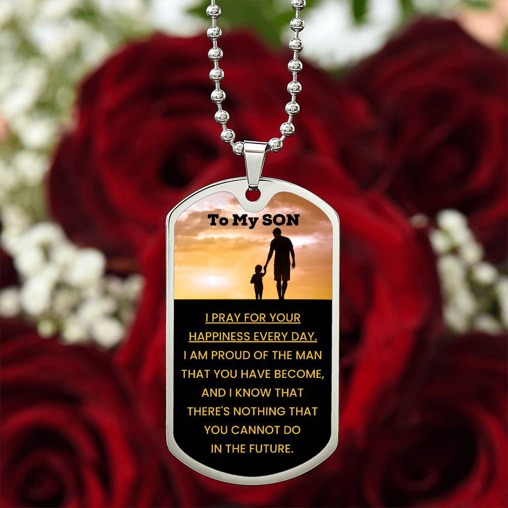 Surprise your son with this heartfelt dog tag necklace. Order today and enjoy Free Shipping!