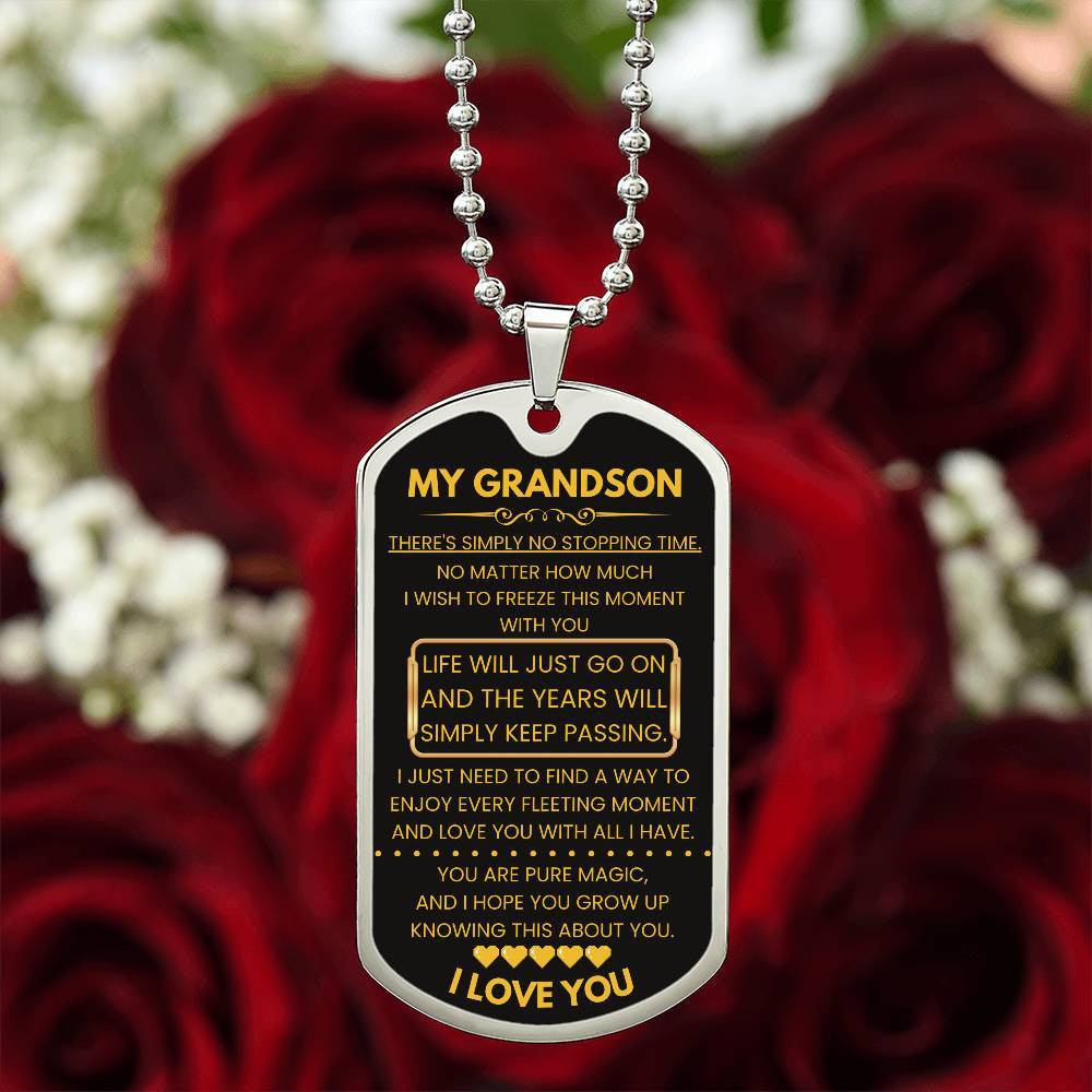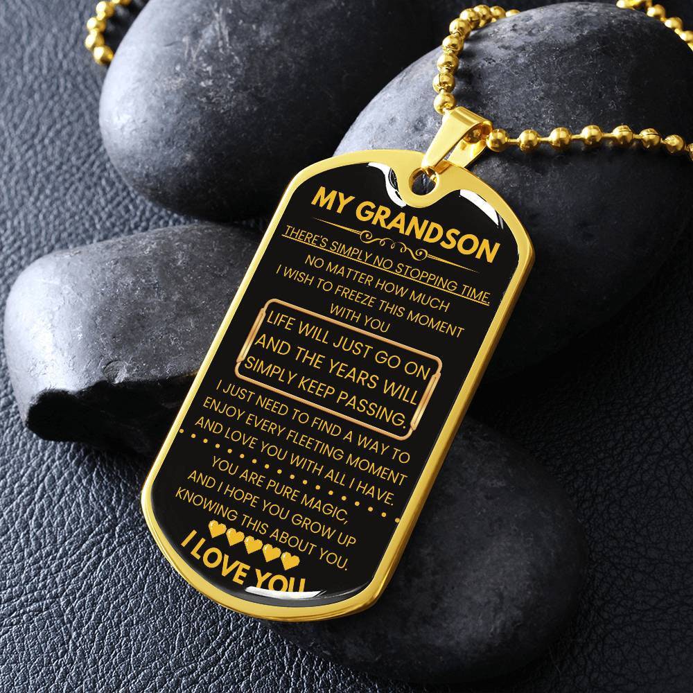 Gift your grandson a meaningful reminder of your love with this heartfelt Dog Tag for Grandson. Engraved with a touching message about the passage of time and the magic he brings to your life, this dog tag serves as a constant reminder of how cherished he is. Made from durable surgical steel with an optional 18k gold finish, it’s more than just a piece of jewelry—it’s a keepsake that captures the love and wonder of your bond.