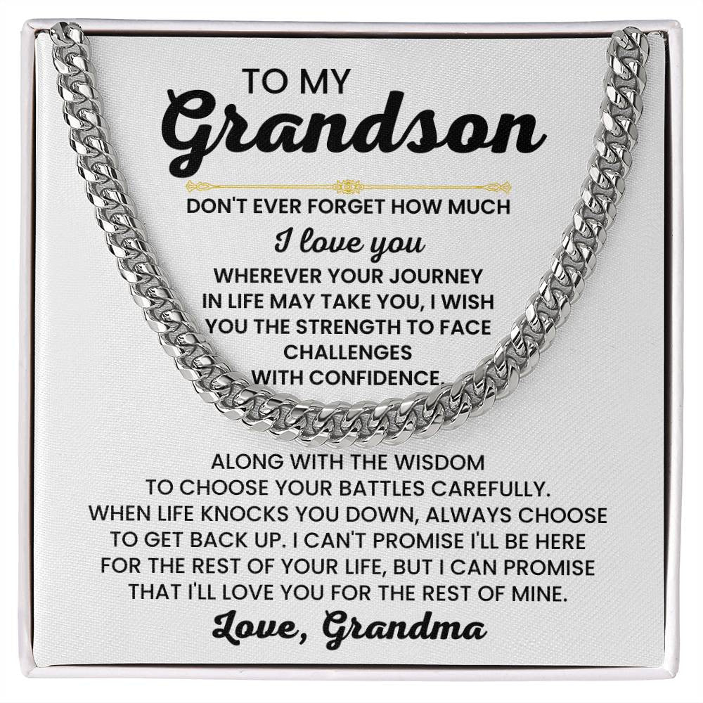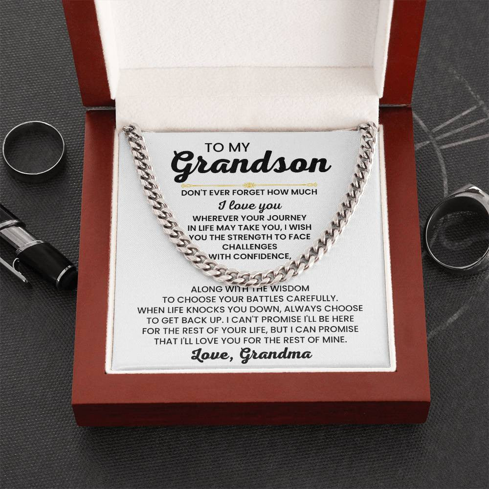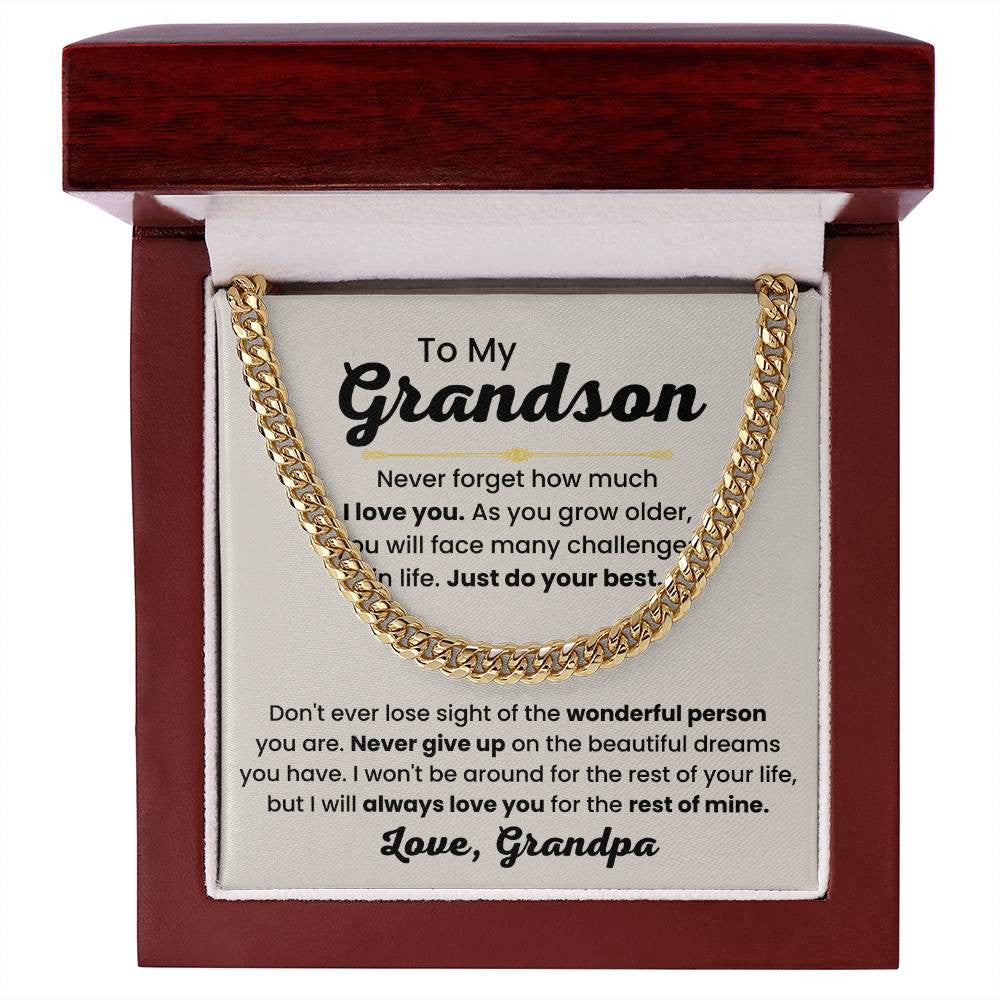 Celebrate the bond you share with your grandson by gifting him this classic Cuban Link Chain, complete with touching message options from Grandpa or Grandma. Each version carries a heartfelt message, whether it's Grandpa's life advice or Grandma's nurturing words, making this necklace more than just an accessory—it's a symbol of love, guidance, and support.