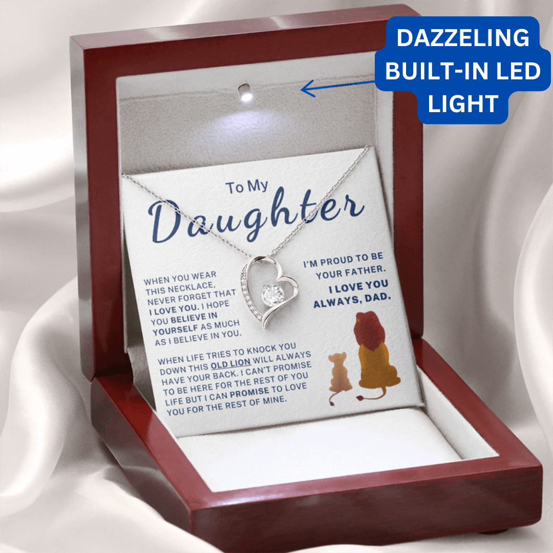 To my daughter, when you war this necklace never forget that I love you. I hope you believe in yourself as much as I believe in you. When life tries to knock you down, this old lion will always have your back. I can't promise to be here for the rest of your life, but I can promise to love you for the rest of mine. I'm proud to be your father. I love you always, dad.
