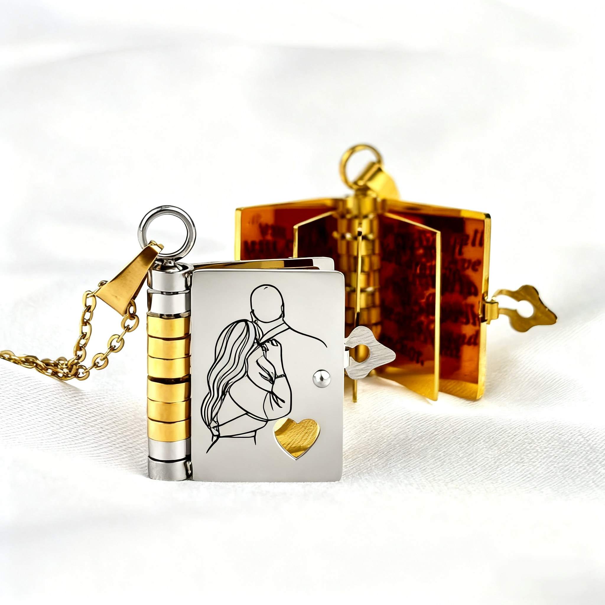 Express your love in a timeless way with our My Love Book Necklace - an engraved stainless steel pendant designed to carry your deepest emotions.