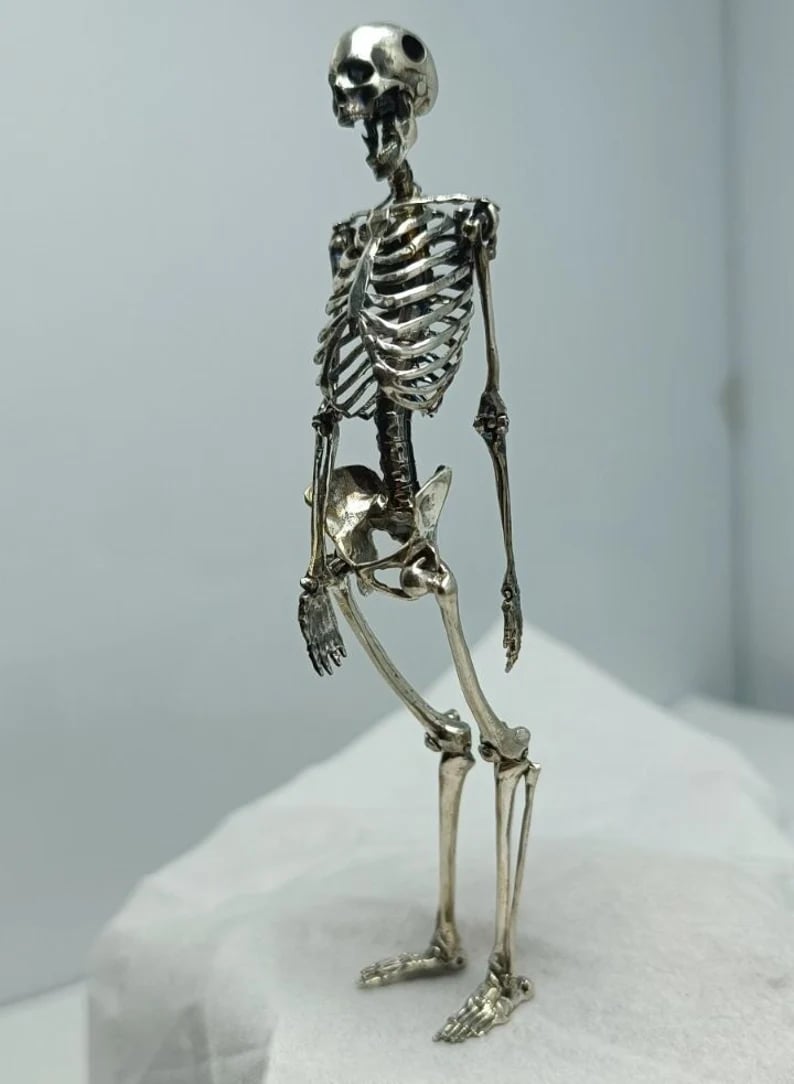 This tiny silver skull might look small, but trust me, it packs a punch! 💥 Every detail is on point—you can see the intricate lines on the bones, it's like a miniature masterpiece straight outta a dark fantasy world. And here's the mind-blowing part: its arms, legs, and mouth are all movable! 🤯 😈 It's like having your own little undead buddy that's always ready to have fun!