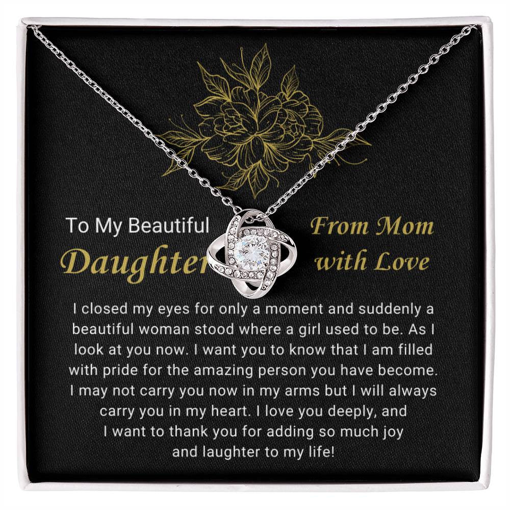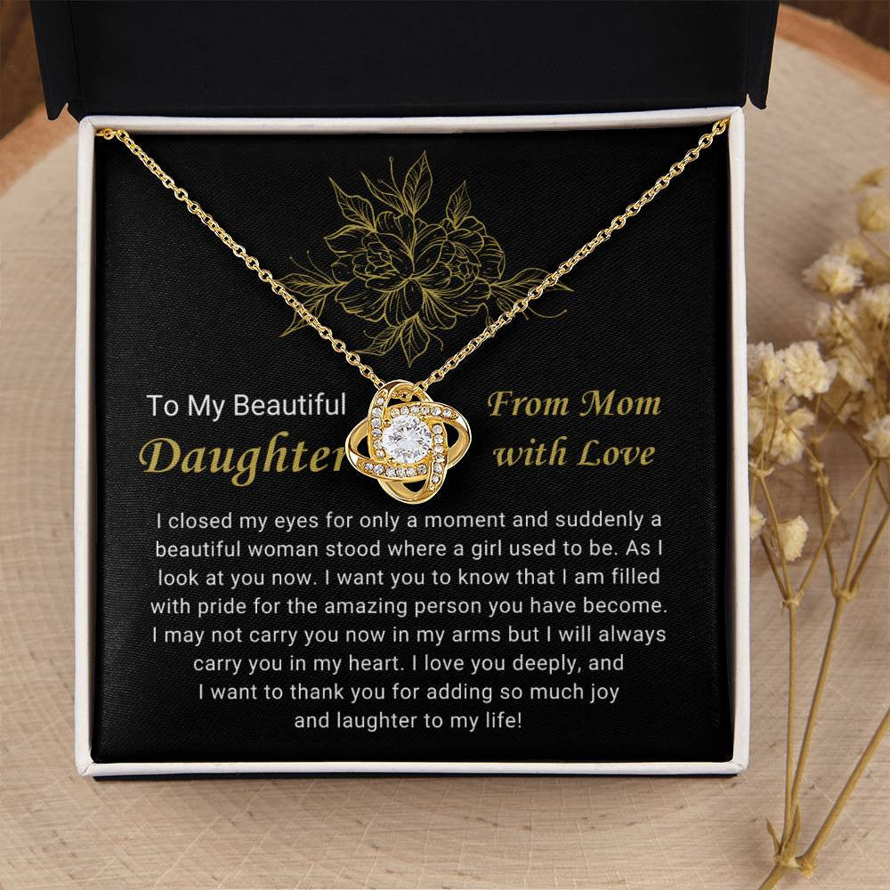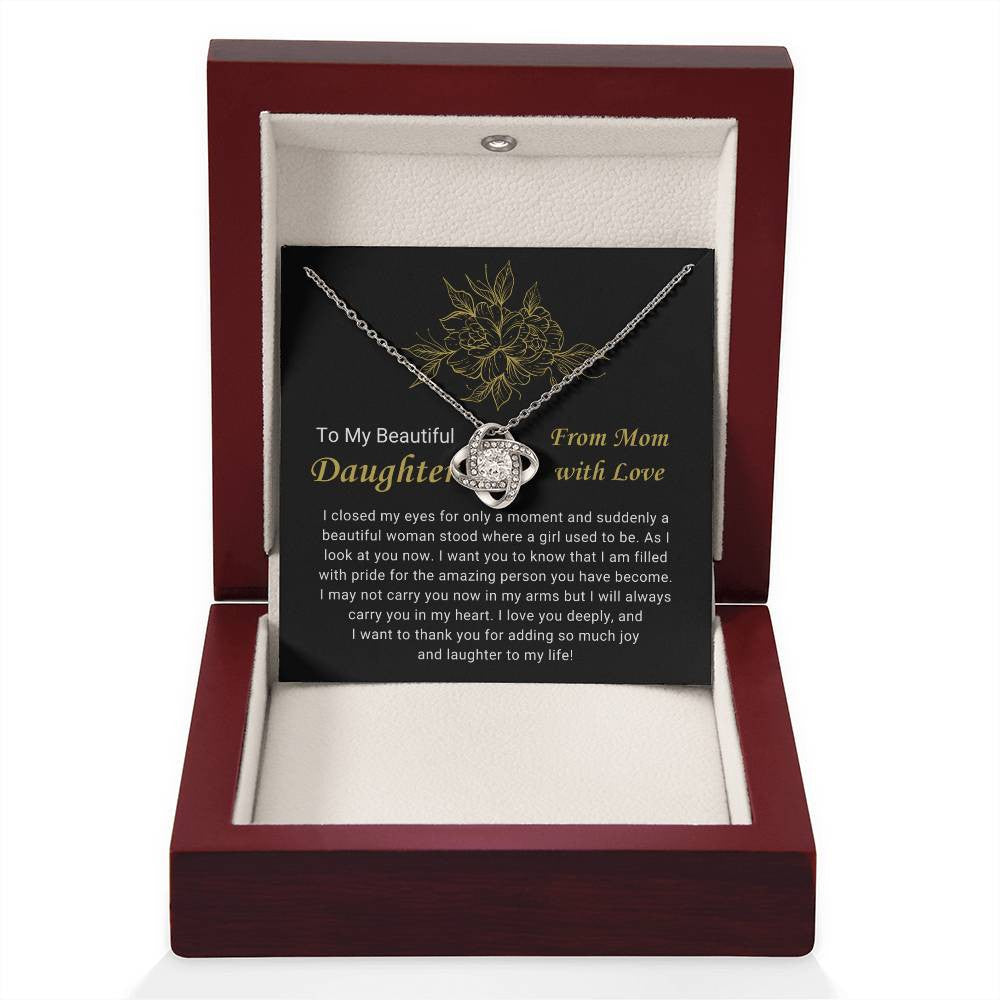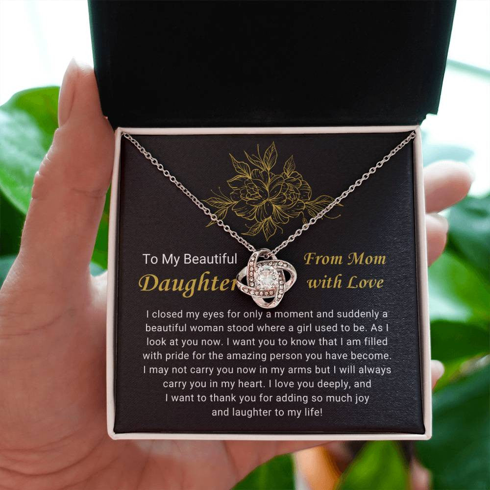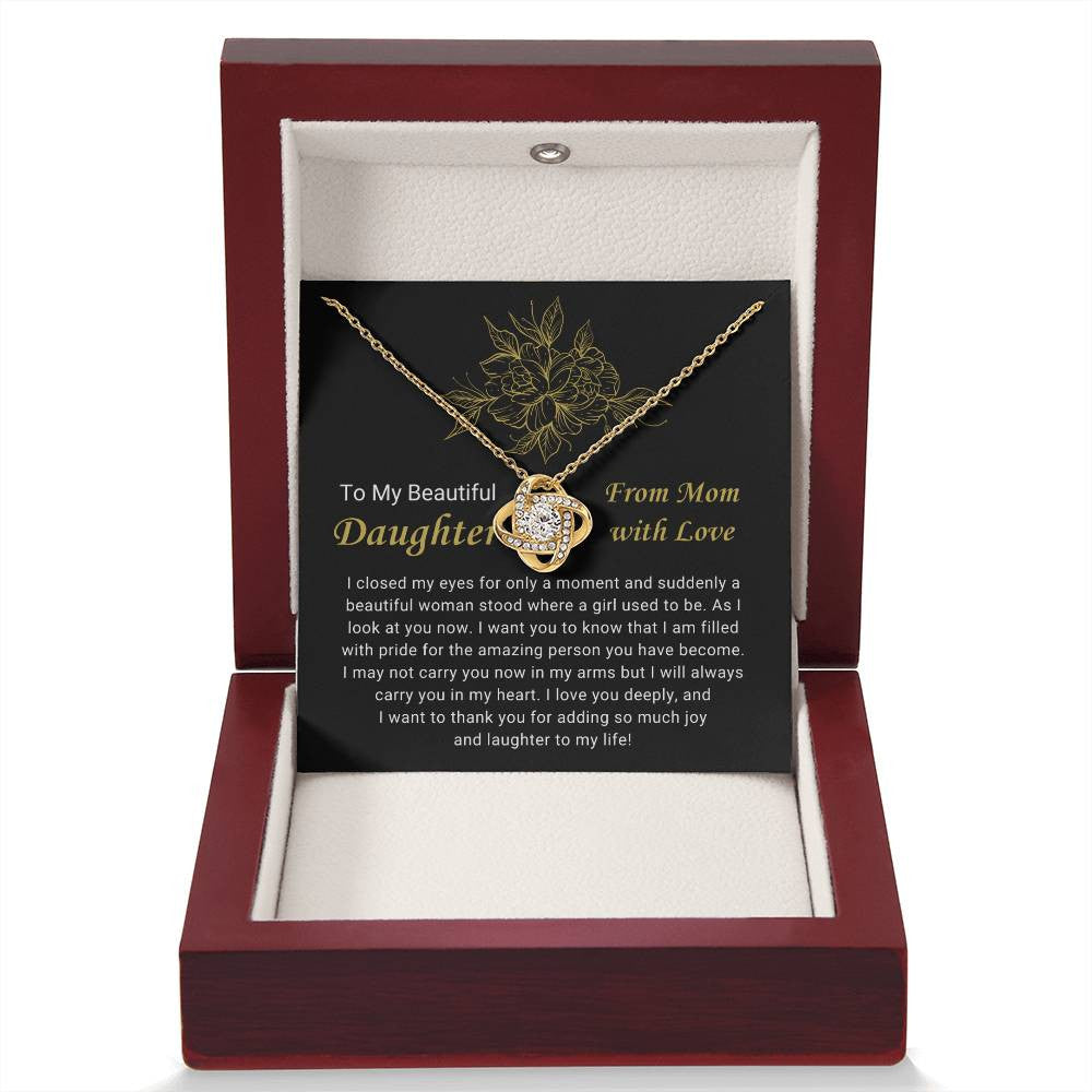 Surprise your daughter with a gift that symbolizes your unbreakable bond and the pride you feel watching her grow. The Love Knot Necklace represents the special connection shared between a mother and daughter, and is a heartfelt reminder that she is always cherished and carried in your heart. Crafted with love, this stunning necklace will make her feel valued every time she wears it.
