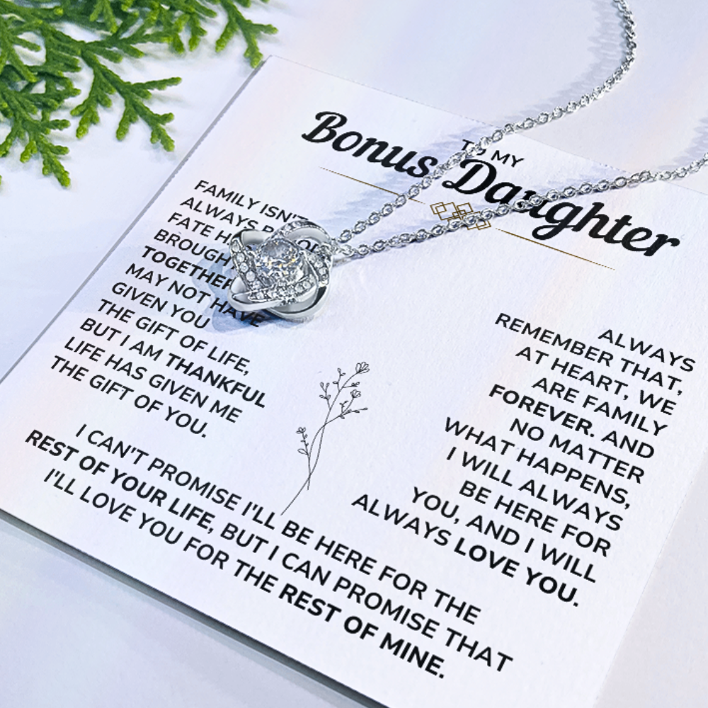 "To my Bonus Daughter, Family isn't always blood. Fate has brought us together. I may not have given you the gift of life, but I am thankful life has given me the gift of you. Always remember that, at heart, we are family forever. And no matter what happens, I will always be here for you, and I will always love you. I can't promise I'll be here for the rest of your life, but I can promise that I'll love you for the rest of mine."