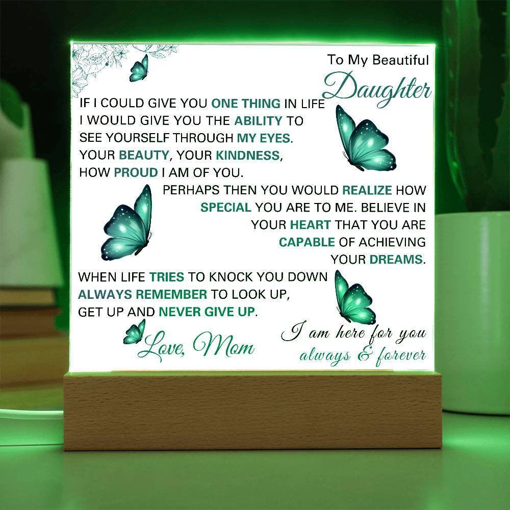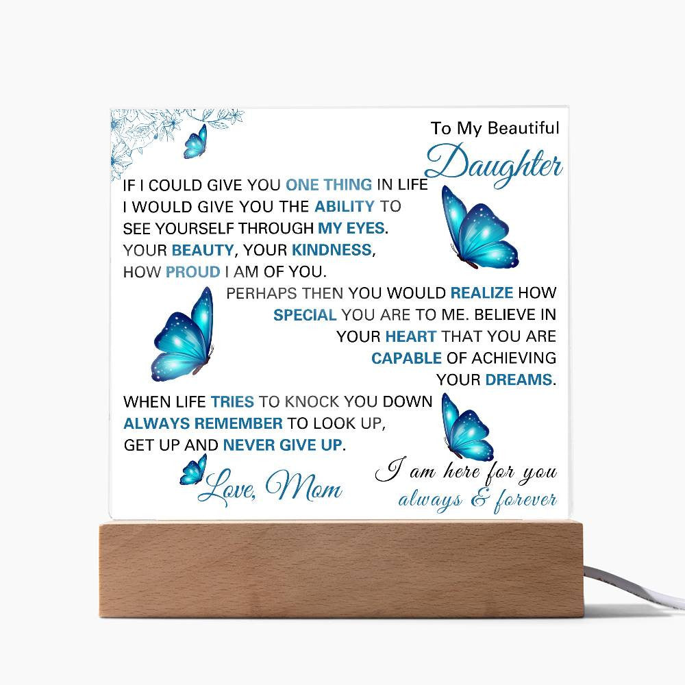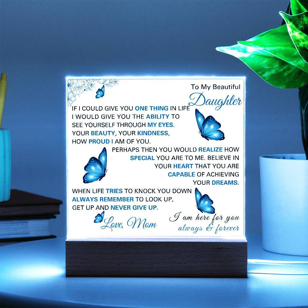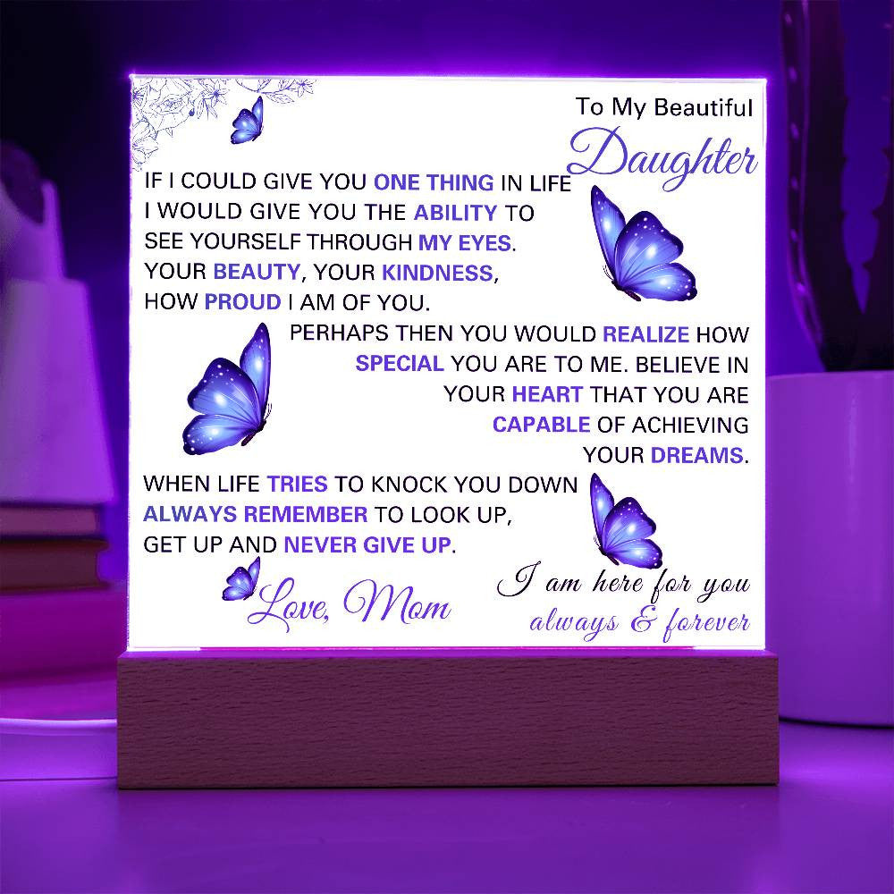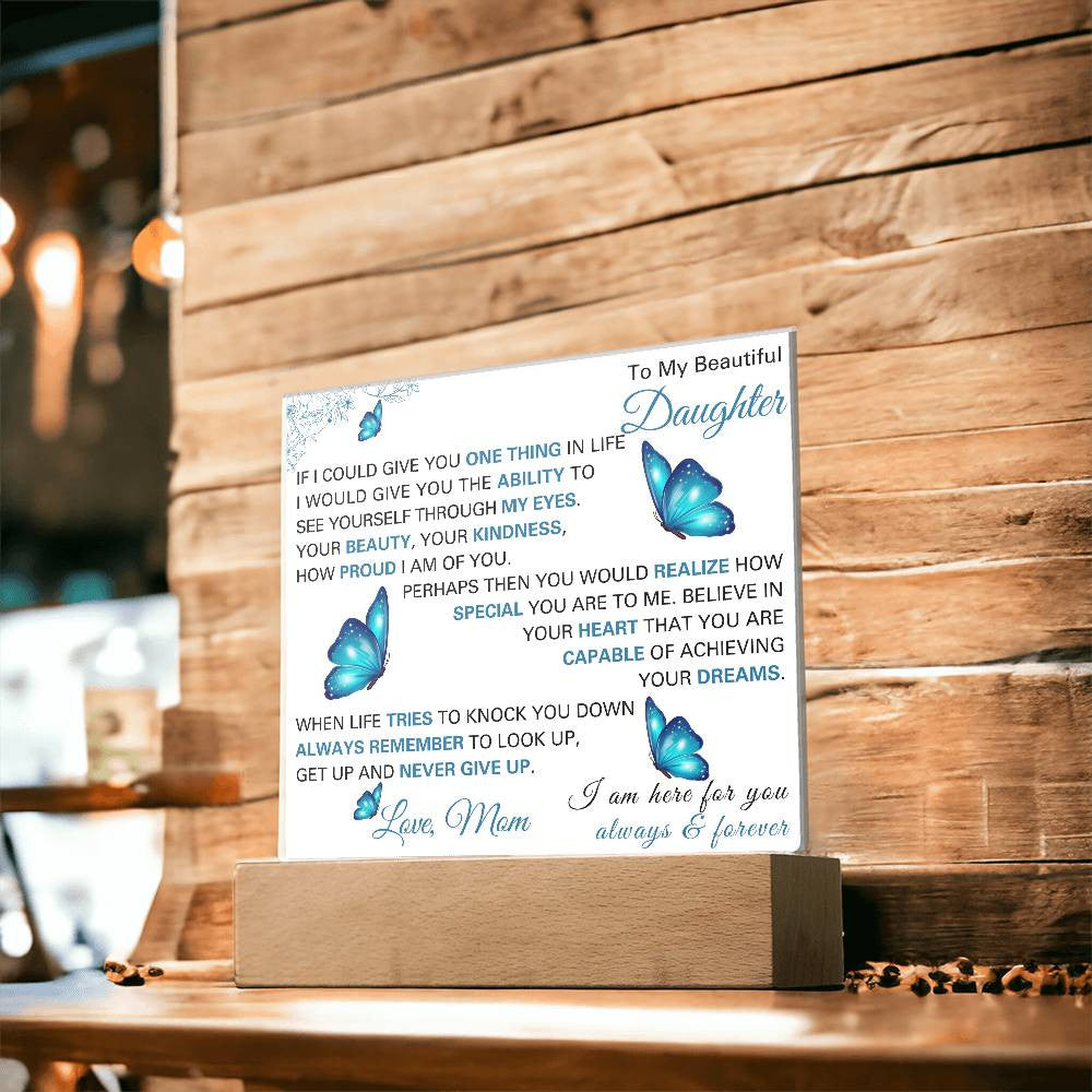 Gift your daughter a daily reminder of how special and capable she is with this beautifully crafted Acrylic Square Plaque. With an inspiring and heartfelt message from Mom, this plaque serves as a constant source of encouragement, reminding her to always believe in herself and her dreams, no matter what life throws her way.