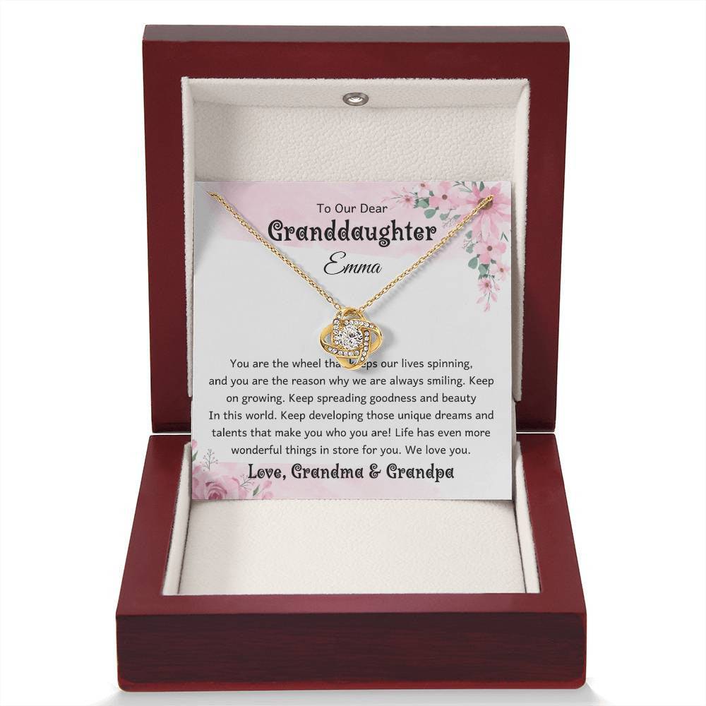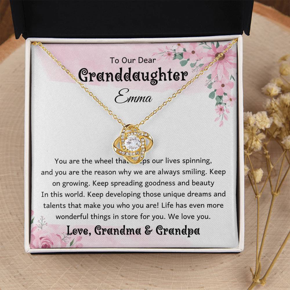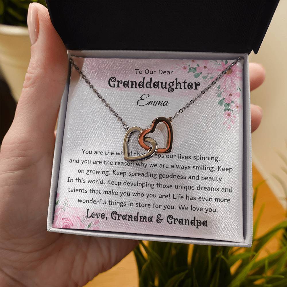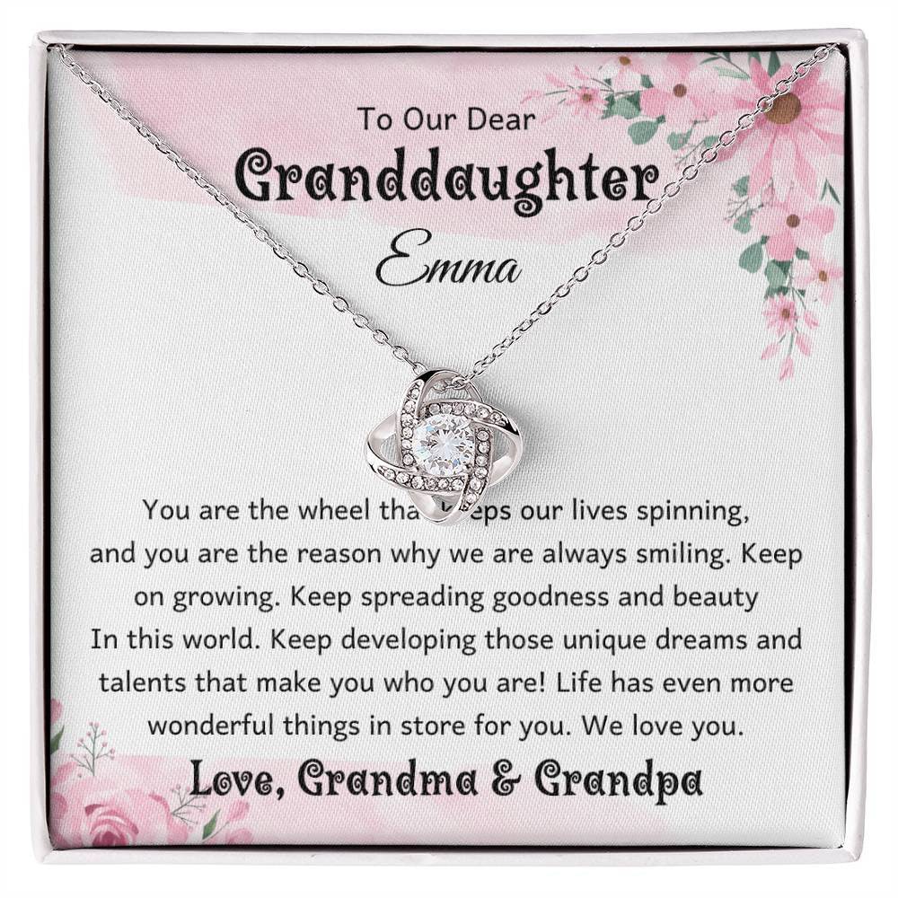 Celebrate the joy your granddaughter brings into your life with this personalized Granddaughter Necklace. Each piece is a heartfelt reminder that she is the light of your lives and that you believe in her endless potential. Whether she’s developing her unique talents or spreading beauty in the world, this necklace will remind her that Grandma and Grandpa are always with her, cheering her on every step of the way.
