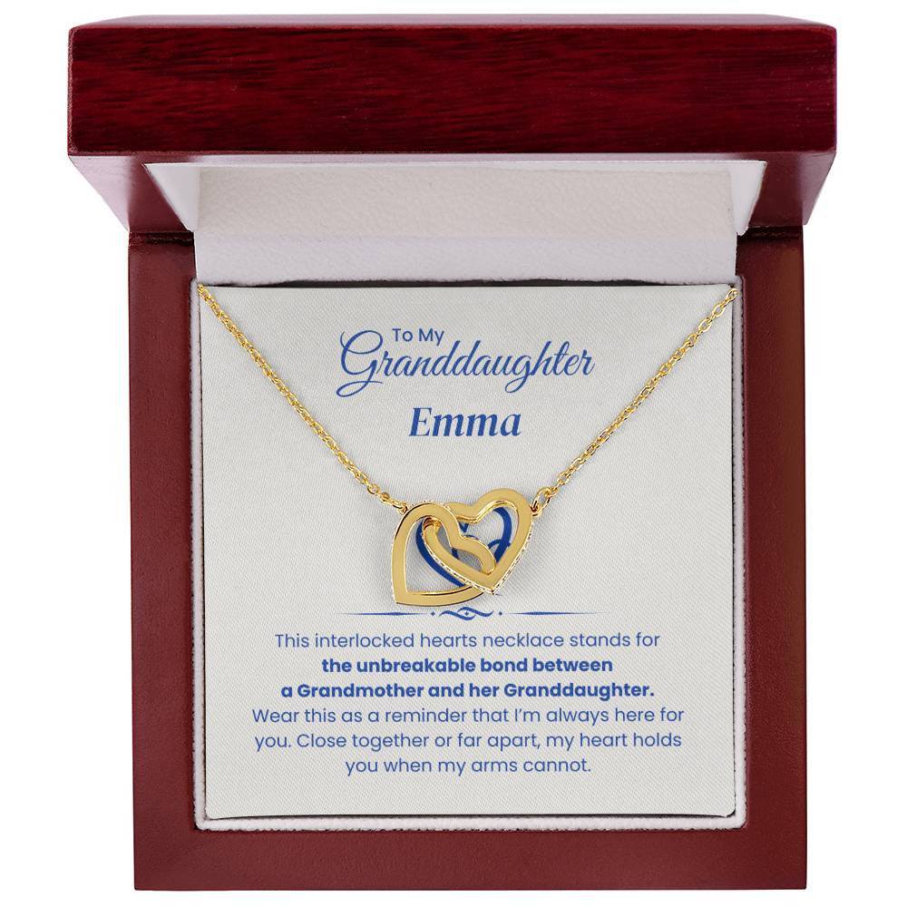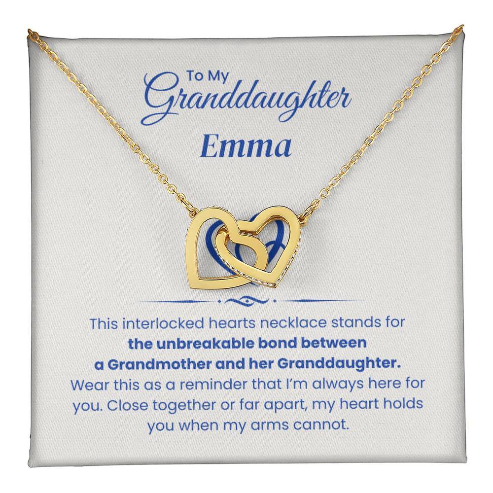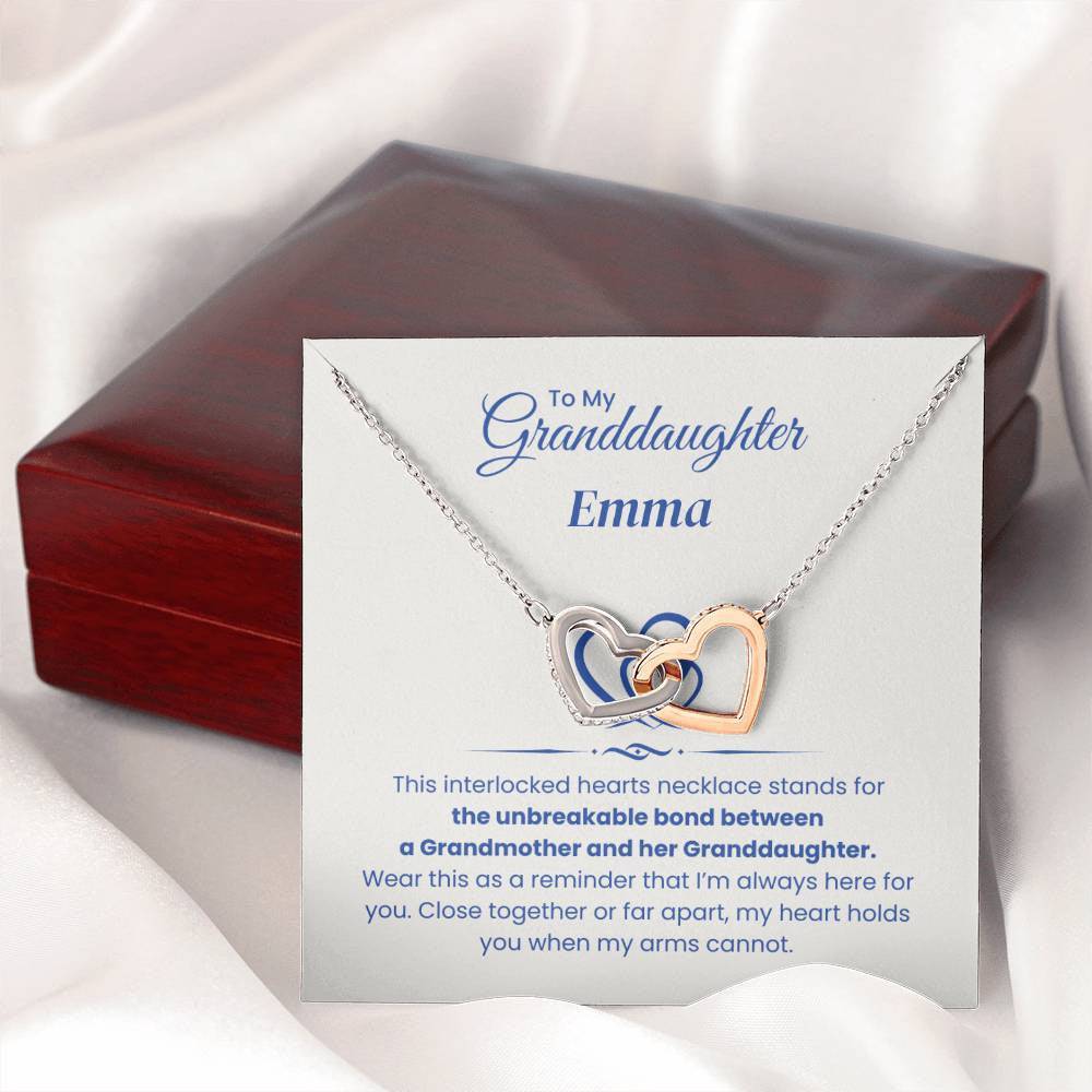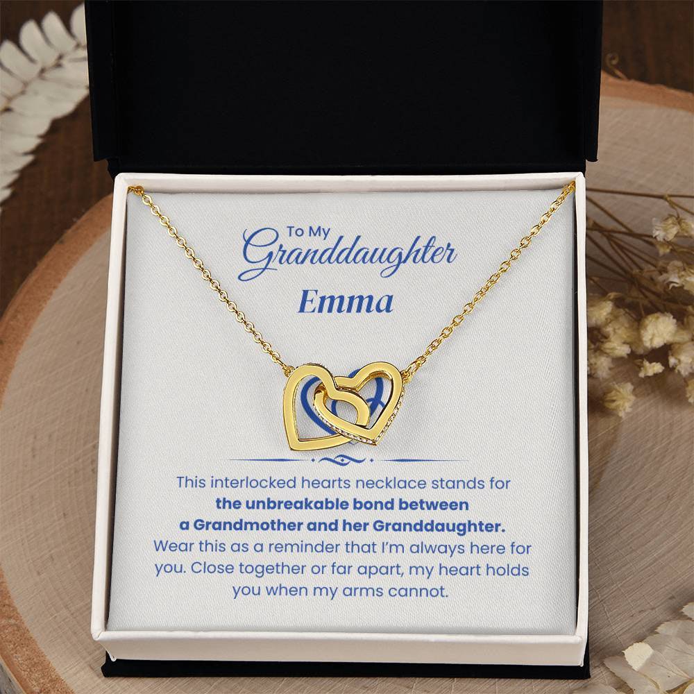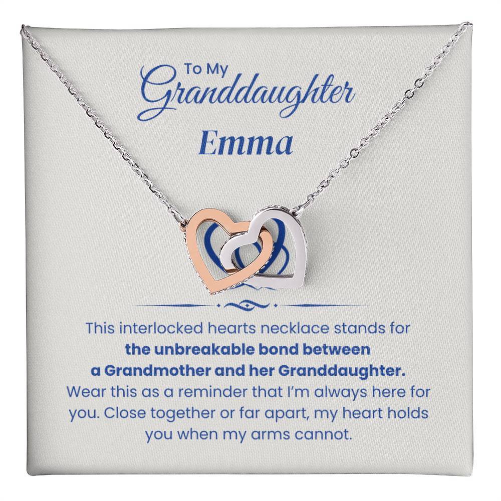 Celebrate the unbreakable bond between you and your granddaughter with the Interlocking Hearts Necklace. This beautiful piece is more than just a necklace – it's a symbol of the love and connection you share, no matter the distance. Each heart represents your everlasting bond, and wearing it will remind her that even when you’re apart, she is always held close to your heart.