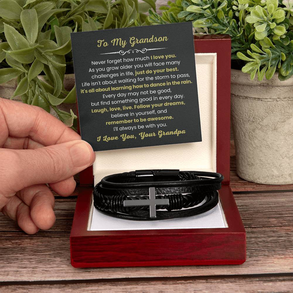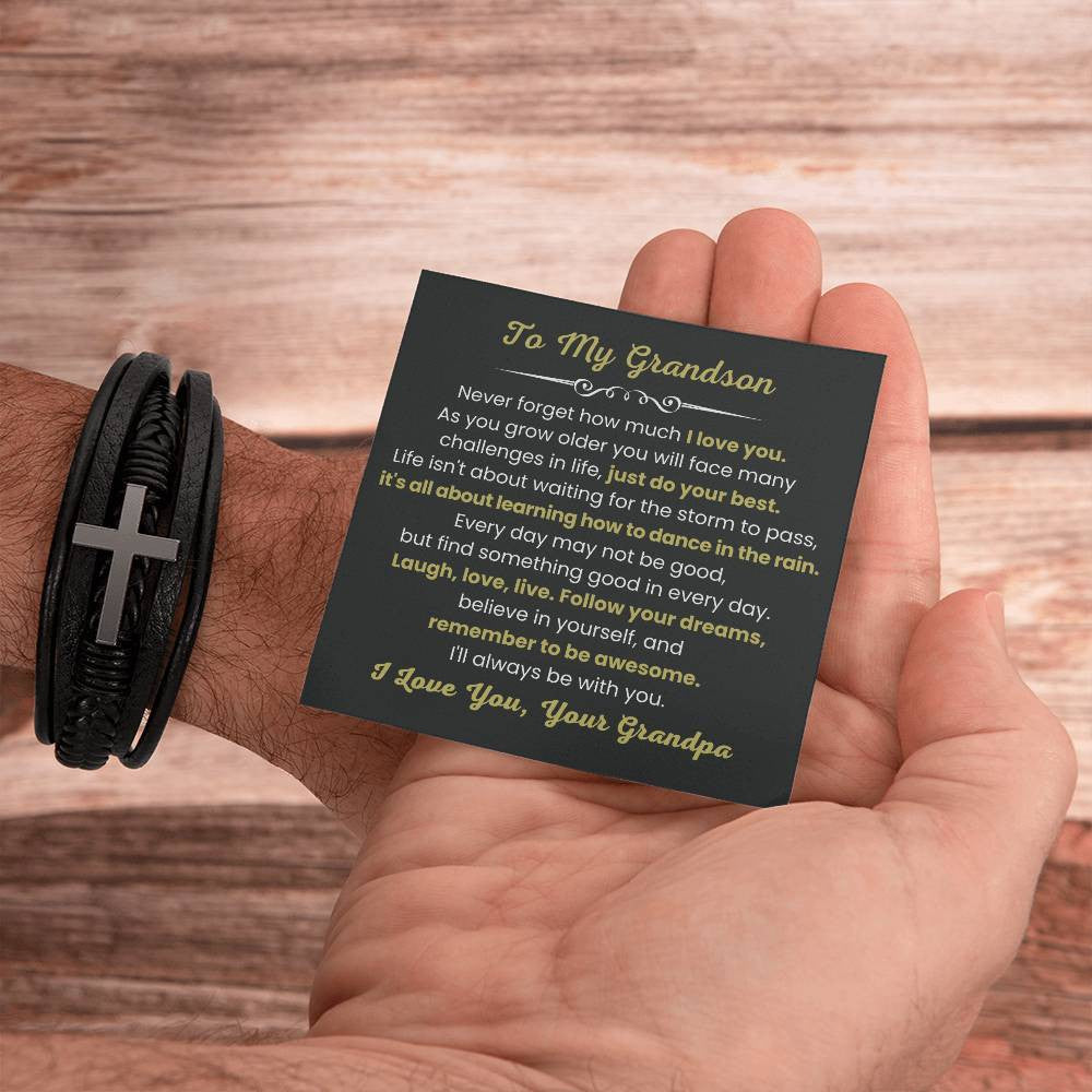 Perfect for birthdays, milestones, or just to show how much you care, the Grandson Bracelet will be a cherished keepsake that he can wear every day. Choose between two unique designs—the Men's Cross Bracelet or the Love You Forever Bracelet—and select the message that best expresses your love and support. This bracelet will serve as a lasting symbol of strength, love, and the cherished memories that will last a lifetime.