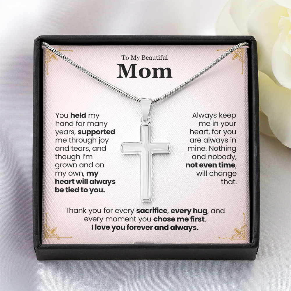 Celebrate the love that never fades. This elegant cross necklace, paired with a heartfelt message, is a timeless reminder of everything Mom means to you. Because her love held you then, and it holds you still.