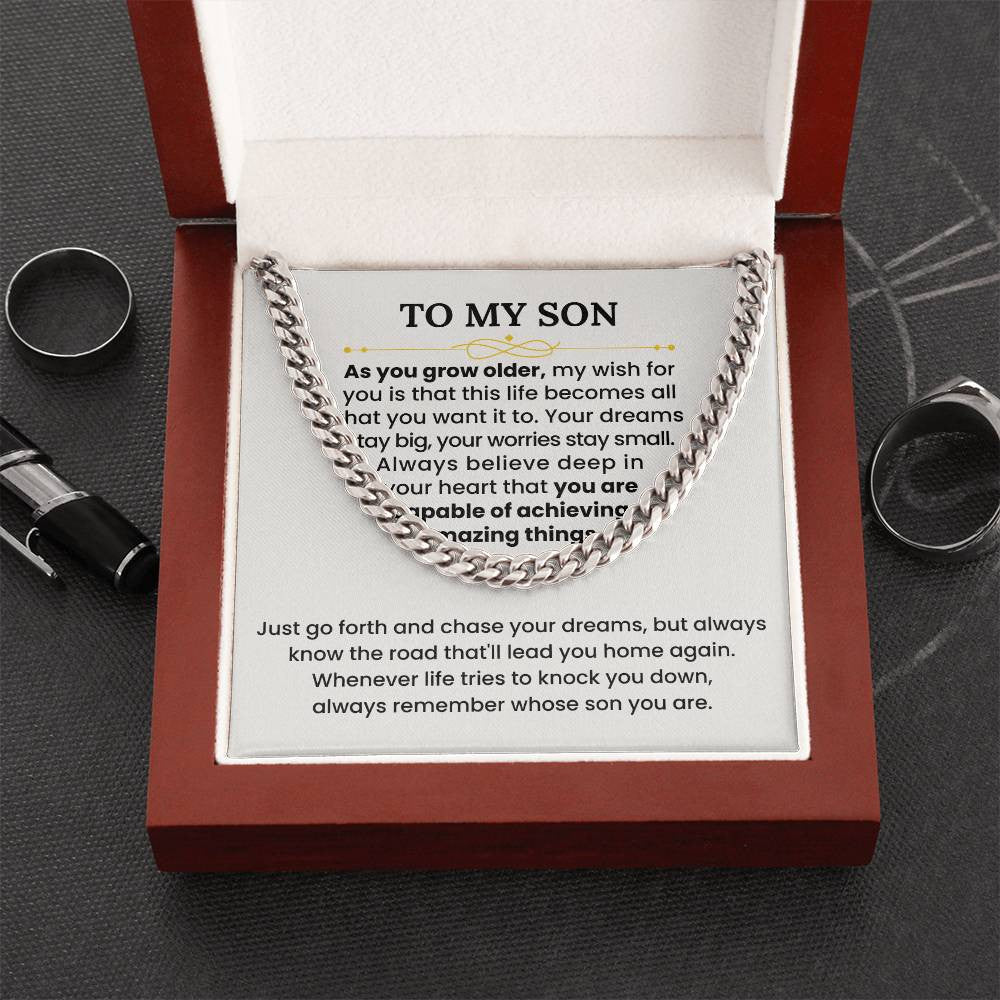 Inspire your son to reach for the stars and embrace life's possibilities with the "Chase Your Dreams" Cuban Link Chain. This thoughtful necklace comes with a heartwarming message card, reminding him that he is capable of achieving anything he sets his mind to. A perfect gift for birthdays, graduations, or any milestone, this necklace serves as a lasting reminder of your support and belief in him.