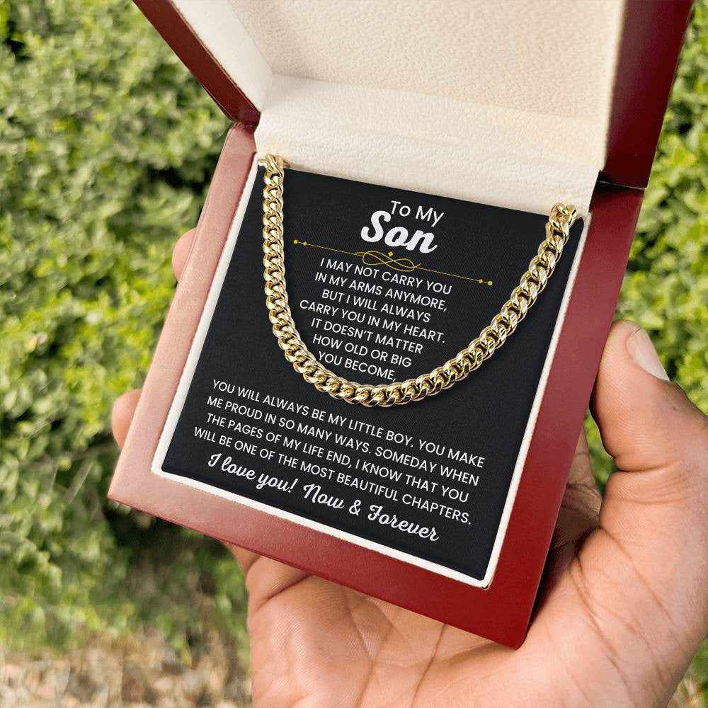 Celebrate the special bond between a mother and son with the "Always in My Heart" Cuban Link Chain. This classic necklace comes with a touching message card, reminding your son that no matter how much he grows, he will always be your little boy. Whether for his birthday, graduation, or a meaningful everyday reminder, this necklace serves as a symbol of your everlasting love and pride.